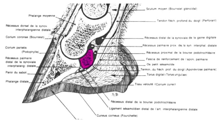 Le syndrome naviculaire décourage souvent plusieurs propriétaires. Il s’agit d’une maladie qui atteint l’os naviculaire (petit os dans le pied du cheval) ou les tissus environnants de ce dernier (ex : ligament, bourse, tendon). L’os naviculaire est représenté en rose à la figure 1 et 2.